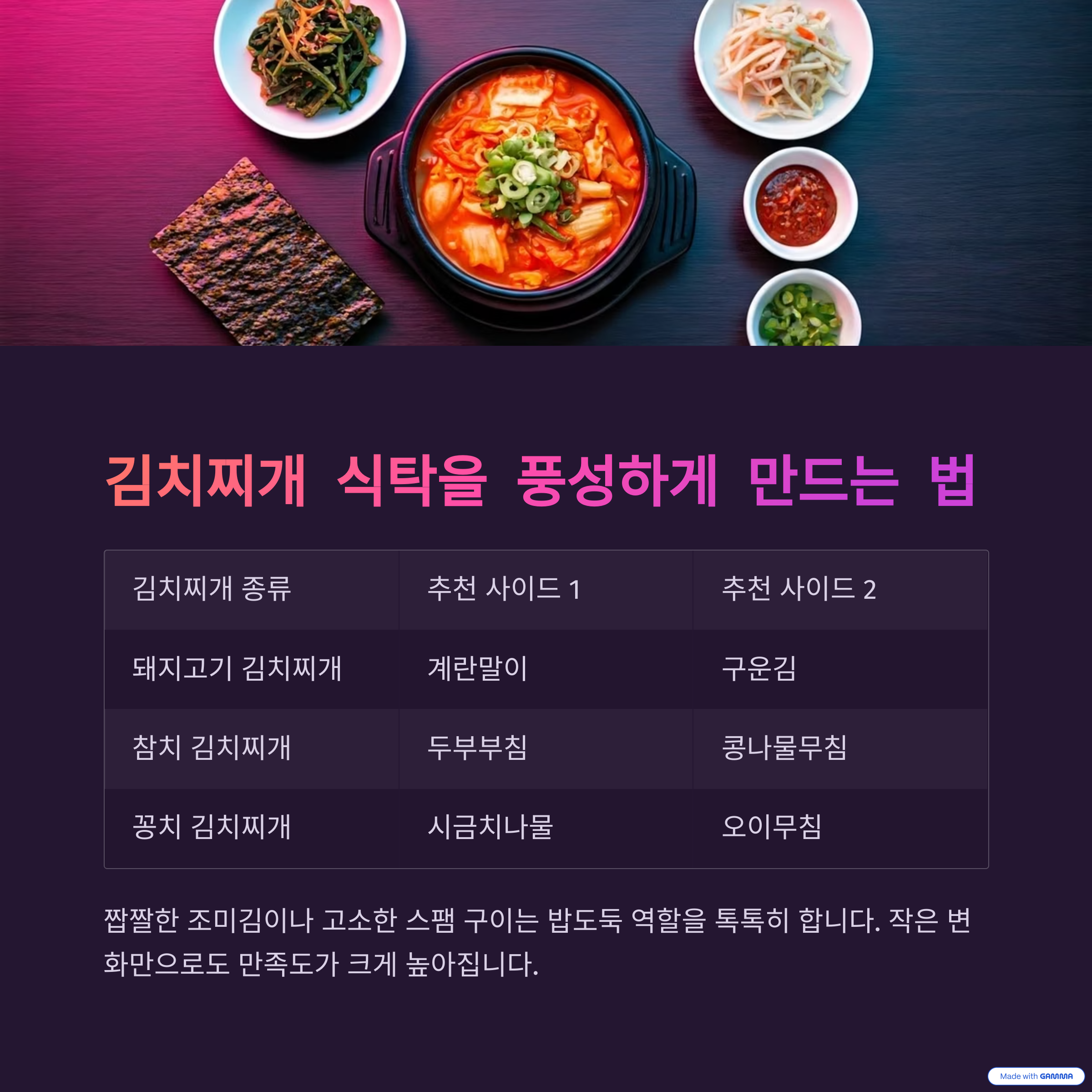 이처럼 작은 변화만으로도 김치찌개 식탁의 만족도를 크게 높일 수 있습니다.