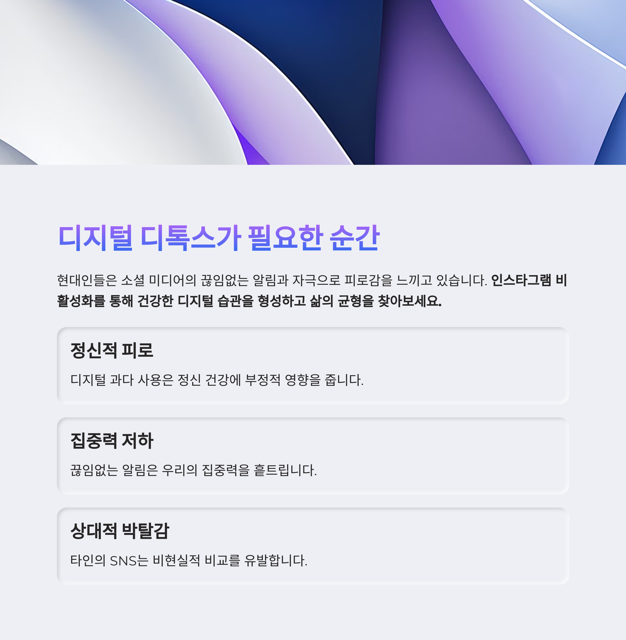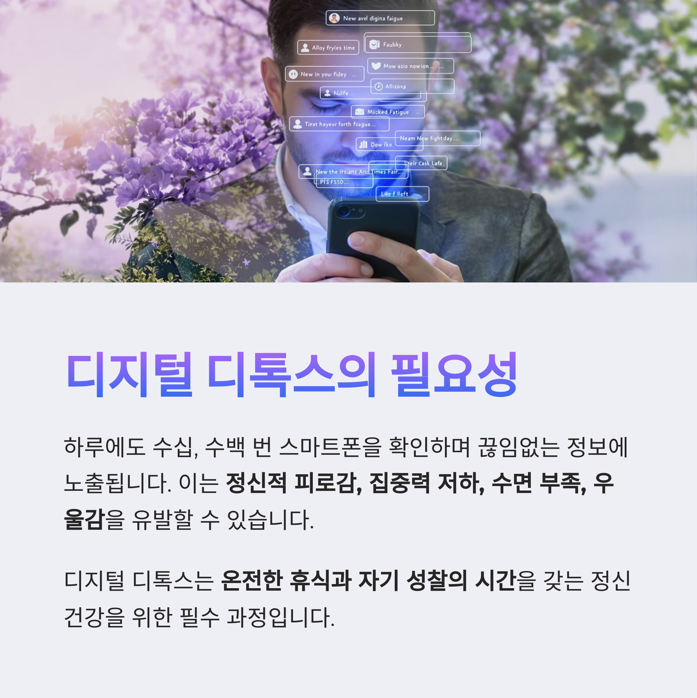 이러한 디지털 환경은 편리함을 제공하지만, 동시에 정신적 피로감, 집중력 저하, 수면 부족, 심지어 우울감까지 유발할 수 있다는 점이 중요합니다.