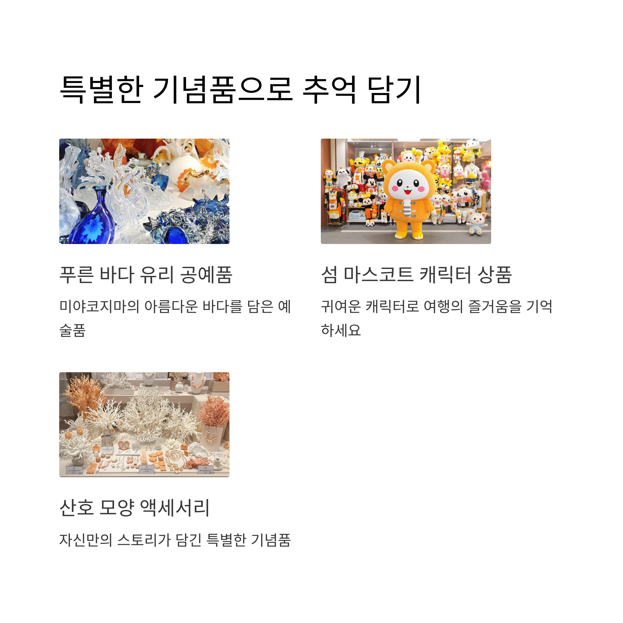 예를 들어, 미야코지마의 푸른 바다를 담은 듯한 유리 공예품이나,