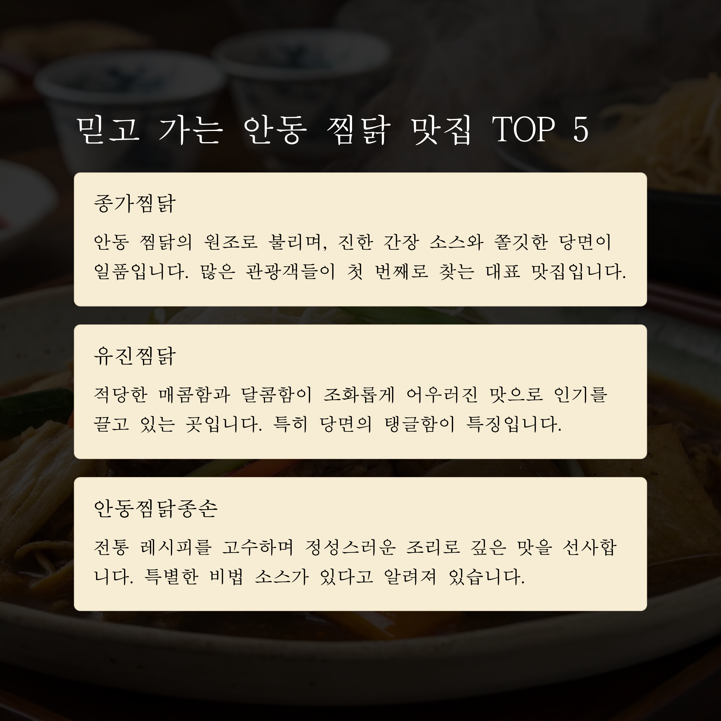 안동은 찜닭의 본고장으로, 매콤하면서도 깊은 양념의 맛과 푸짐한 양으로 많은 사람들의 입맛을 사로잡고 있는 도시입니다. 전국적으로 유명한 안동찜닭골목부터, 현지인들이 애정하는 숨은 찜닭집까지 다양한 찜닭 맛집들이 밀집해 있어 어디를 가야 할지 고민되는 분들도 많으실 텐데요. 본 포스팅에서는 리뷰와 평가를 기반으로 현지에서 특히 추천되는 안동 찜닭 맛집 5곳을 정리해 소개해드리겠습니다. 여행자뿐만 아니라 안동 주민들도 자주 찾는 찐 맛집 리스트이니 참고하셔서 실패 없는 안동 찜닭 여행이 되시길 바랍니다! 양 많은 집, 전통 맛집, 위생 깔끔한 가게 등 다양한 테마별로 소개해드릴 테니 기호에 맞게 선택해보세요.