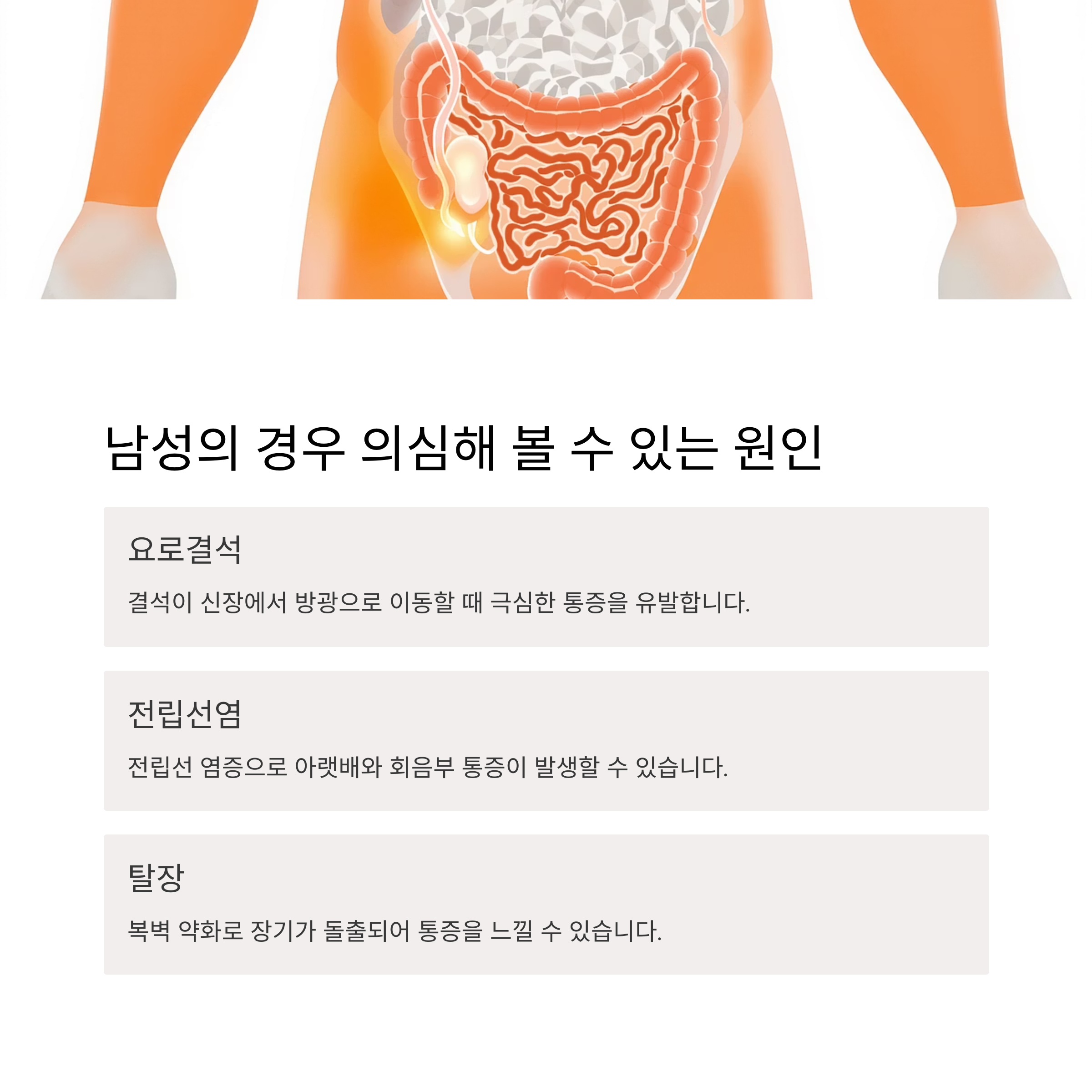 질문: 그렇다면 남성의 경우 왼쪽 아랫배 통증 시 의심할 수 있는 질환은 무엇인가요?