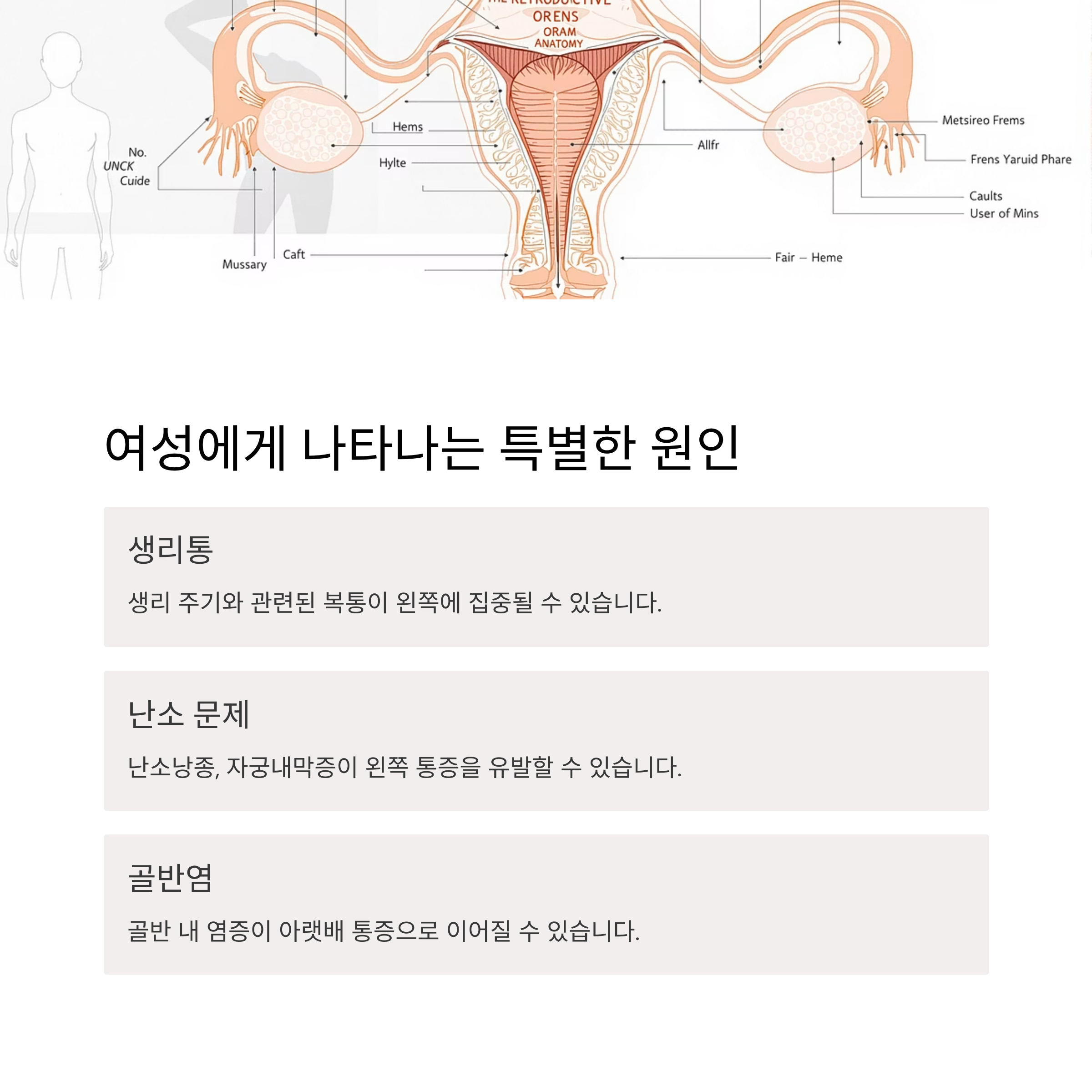 답변: 여성분들의 경우, 왼쪽 아랫배 통증은 생리통의 일종일 수도 있고, 자궁내막증이나 난소낭종, 골반염과 같은 산부인과적 문제와 연관될 가능성도 있습니다. 특히 통증이 생리 주기와 관련이 있거나, 부정 출혈, 분비물 이상 등의 증상이 동반된다면 산부인과 검진을 받아보는 것이 중요합니다. 통증의 양상과 주기를 잘 관찰하는 것이 진단에 도움이 될 수 있습니다.