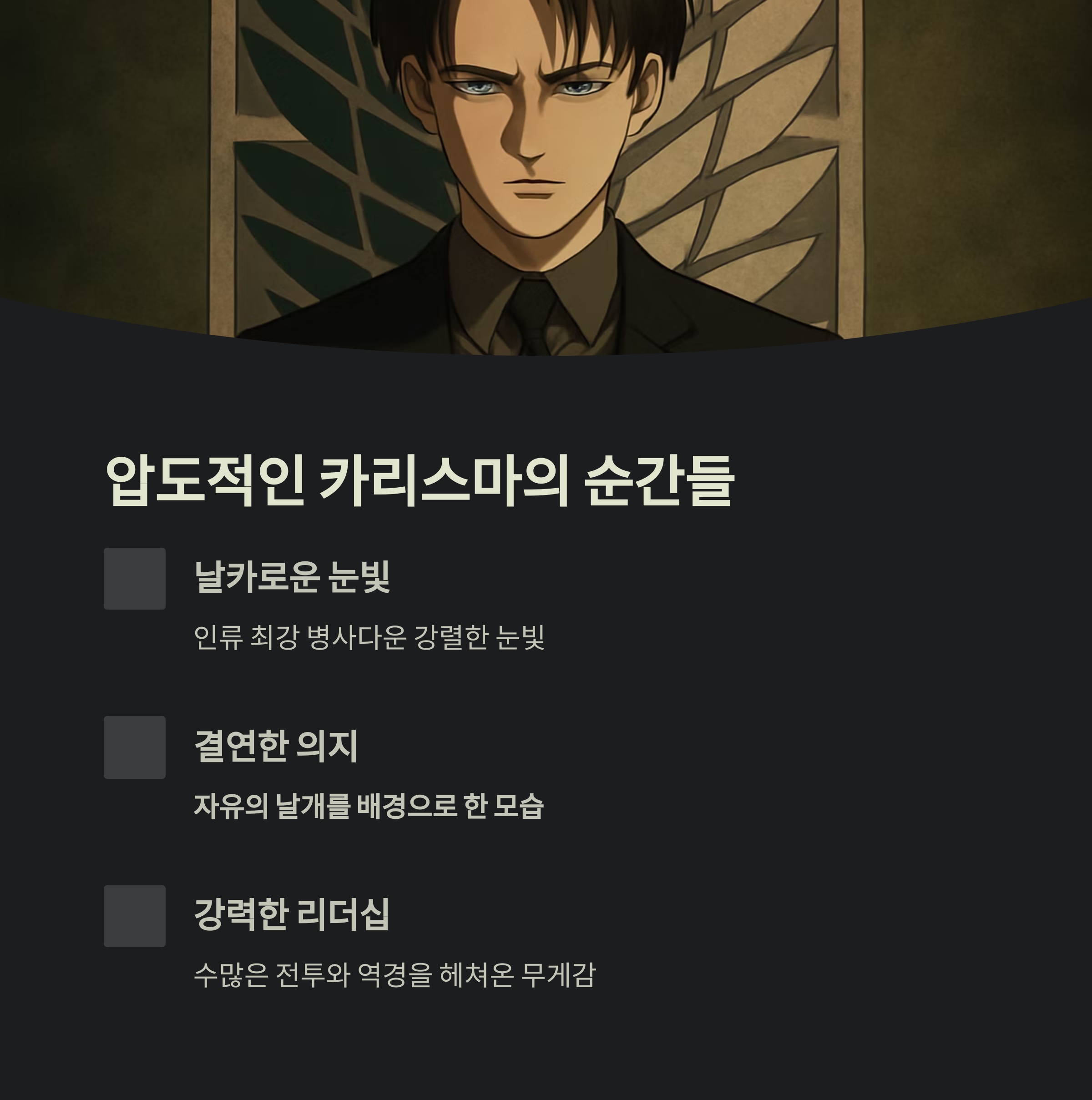 리바이 병장하면 가장 먼저 떠오르는 이미지는 단연 그의 압도적인 카리스마일 것입니다.