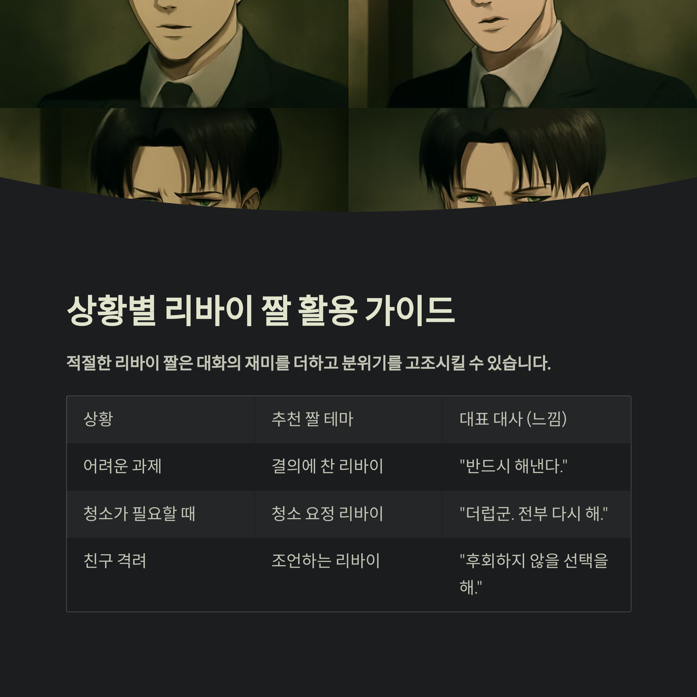 결국 리바이 짤의 매력은 진지함과 유쾌함을 넘나드는 그의 다채로운 모습에 있습니다.