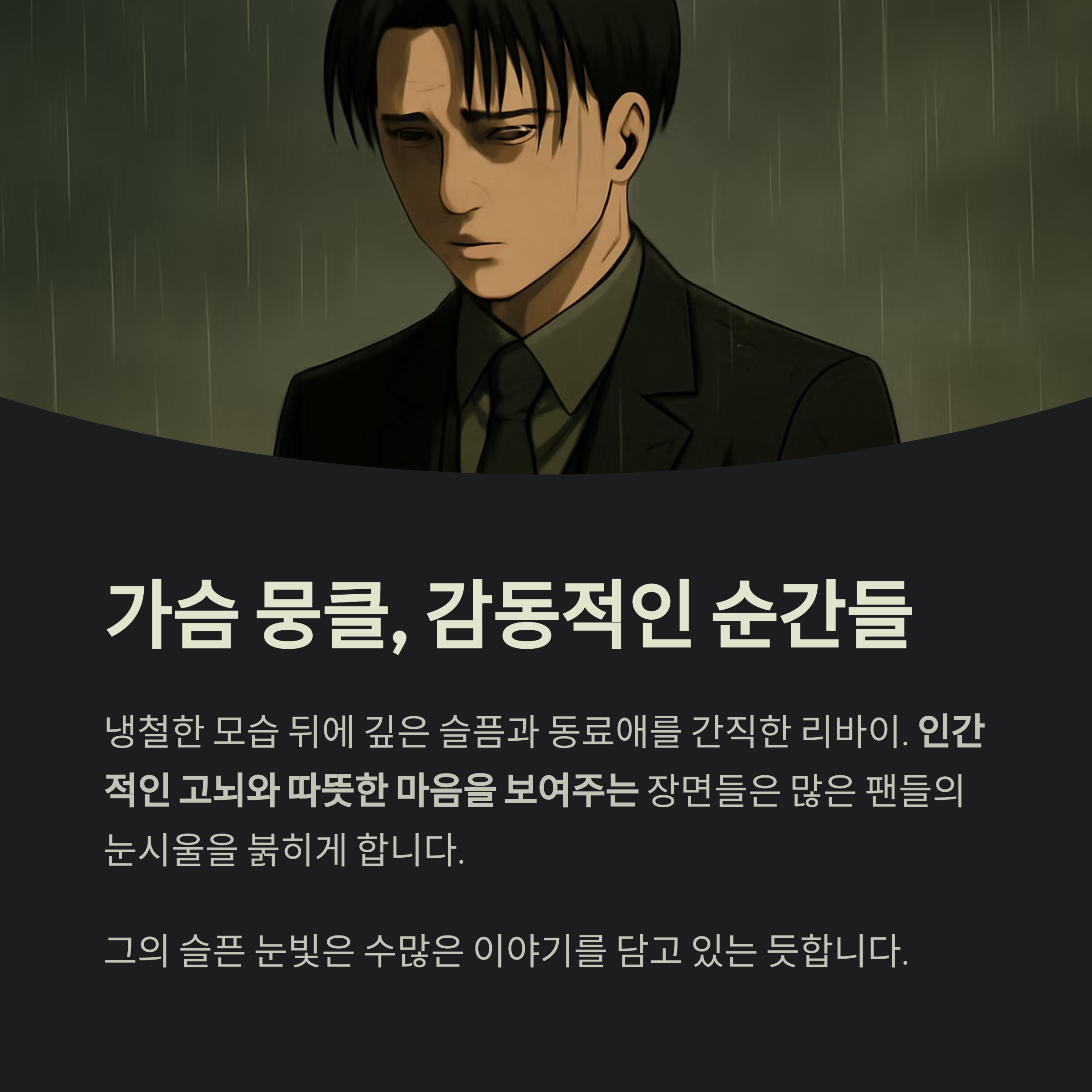 리바이 병장은 냉철하고 강인한 모습 뒤에 깊은 슬픔과 동료애를 간직한 캐릭터입니다.