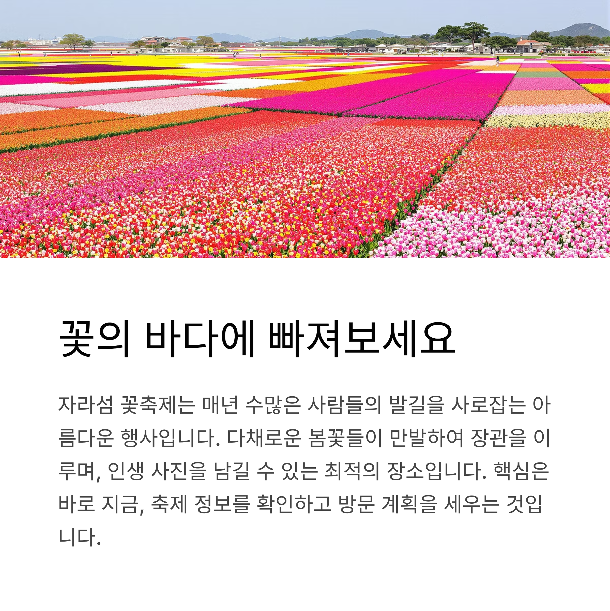 자라섬 꽃축제는 매년 수많은 사람들의 발길을 사로잡는 아름다운 행사입니다.