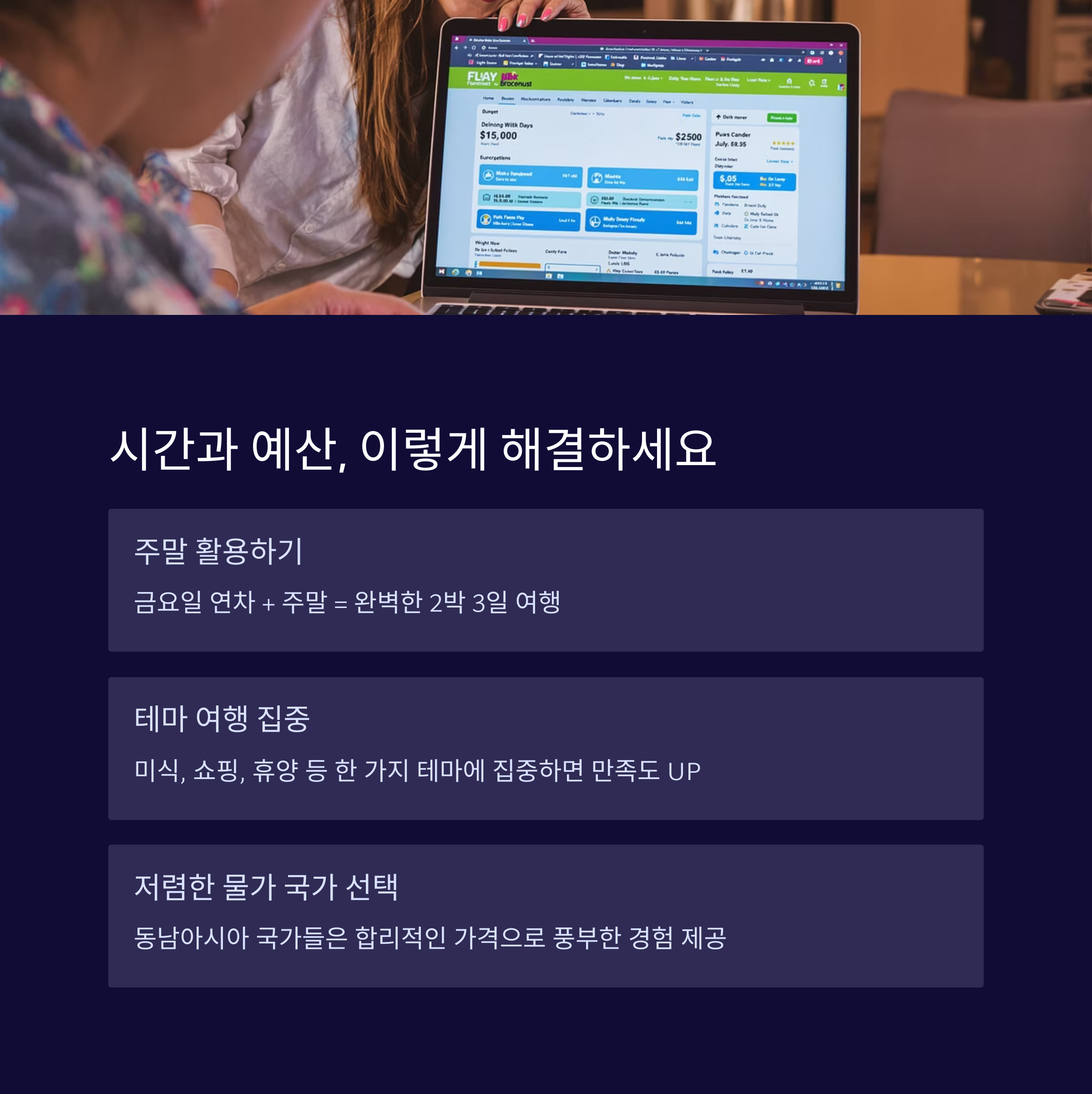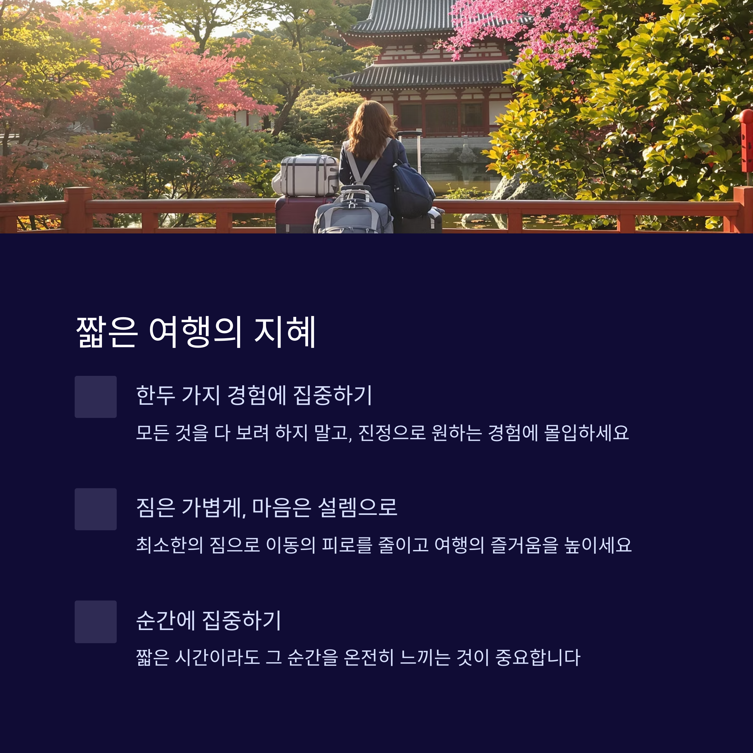 혹시 짧은 휴가 기간과 한정된 예산 때문에 해외여행을 망설이고 계신가요? 걱정하지 마세요. 우리 주변에는 짧은 일정으로도 충분히 매력적인 경험을 할 수 있는 여행지들이 많습니다. 예를 들어, 주말을 포함한 2박 3일 또는 3박 4일 일정으로도 일본의 미식 도시나 대만의 활기찬 야시장을 충분히 즐길 수 있습니다. 또한, 동남아시아의 일부 국가는 저렴한 물가 덕분에 부담 없이 다녀올 수 있는 필수 선택지 중 하나입니다. 중요한 것은 여행의 길이가 아니라 여행의 질이라는 점을 기억하세요. 철저한 계획과 정보 탐색을 통해 시간과 예산의 제약을 극복하고 만족스러운 여행을 만들 수 있습니다.