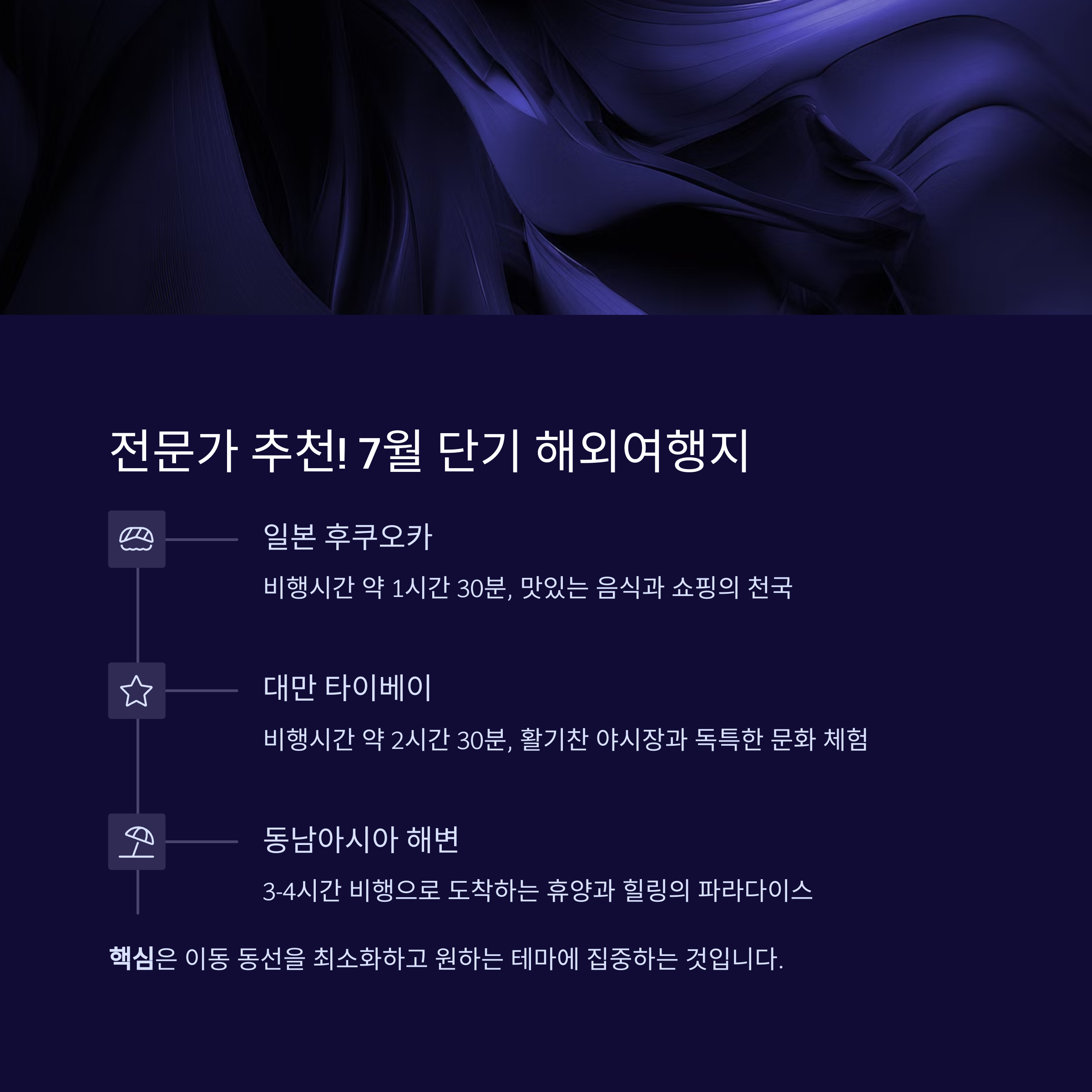 전문가: 안녕하세요! 7월에 3일 정도라면 가까운 아시아 국가들이 아주 좋습니다. 예를 들어 일본의 후쿠오카는 비행시간도 짧고 맛있는 음식과 쇼핑을 즐기기에 완벽한 곳이죠. 대만의 타이베이도 독특한 문화와 다양한 먹거리로 짧은 기간 동안 강렬한 인상을 남길 수 있습니다. 핵심은 이동 동선을 최소화하고 원하는 테마에 집중하는 것입니다. 예를 들어 미식 여행, 문화 탐방 등 한두 가지 주제를 정해 계획을 세우시면 더욱 만족스러운 여행이 될 거예요. 항공권과 숙소는 미리 예약하는 것이 필수입니다.