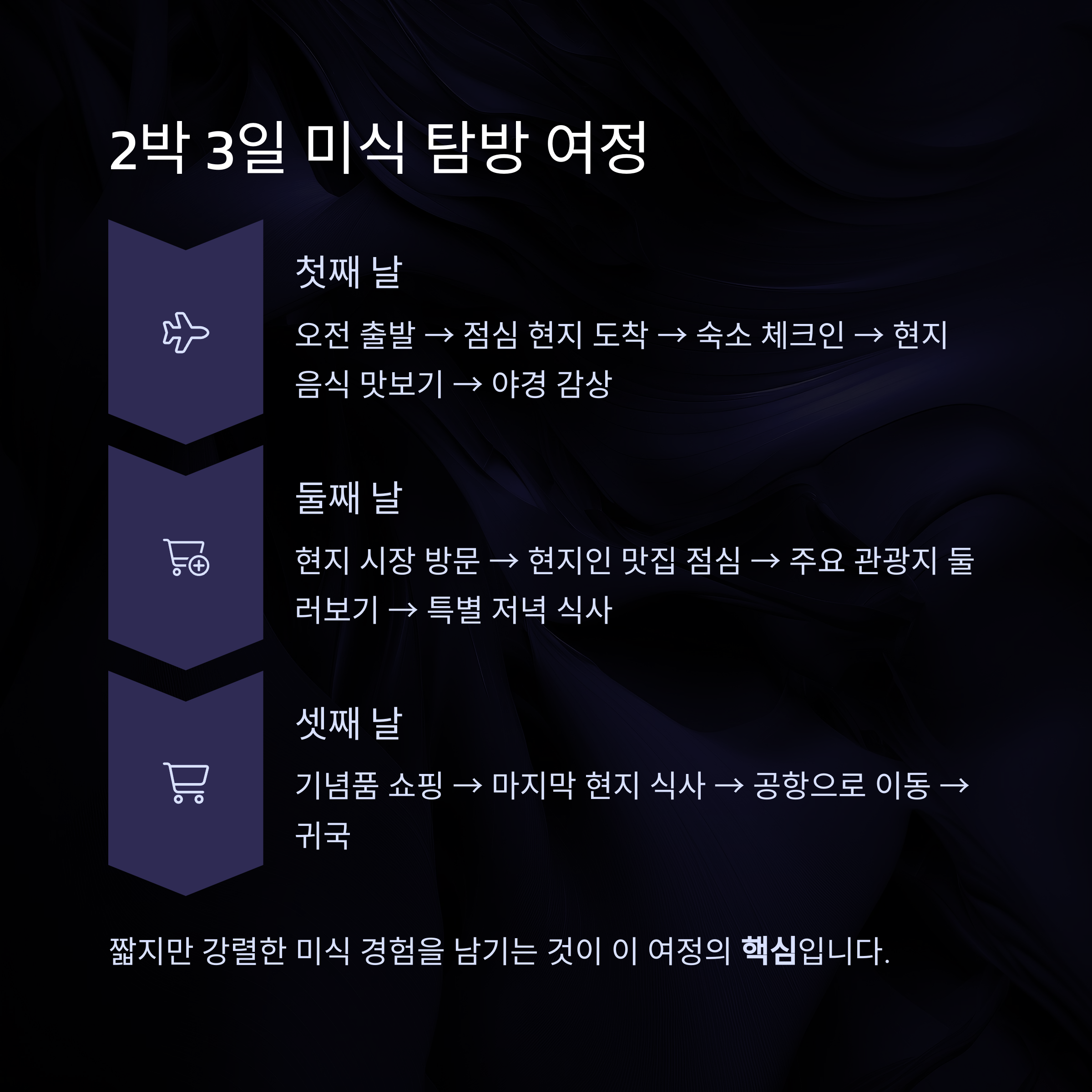 첫째 날, 오전에 출발하여 점심 무렵 현지에 도착합니다. 숙소에 짐을 풀고 가볍게 현지 음식을 맛보며 첫인상을 느껴봅니다. 저녁에는 그 도시의 야경을 감상할 수 있는 곳을 찾아 하루를 마무리합니다. 둘째 날, 아침 일찍 일어나 현지인들이 즐겨 찾는 시장을 방문해 보세요. 신선한 식재료와 활기찬 분위기를 느낄 수 있습니다. 점심과 저녁은 미리 조사해 둔 맛집을 탐방하며 미식의 즐거움을 만끽합니다. 중요한 것은 다양한 종류의 음식을 경험해 보는 것입니다. 마지막 날, 오전에는 기념품을 구입하거나 못 가본 명소를 잠시 둘러봅니다. 공항으로 이동하기 전, 마지막으로 현지 특색이 담긴 간식을 맛보는 것도 좋습니다. 짧지만 강렬한 미식 경험을 남기는 것이 이 여정의 핵심입니다.