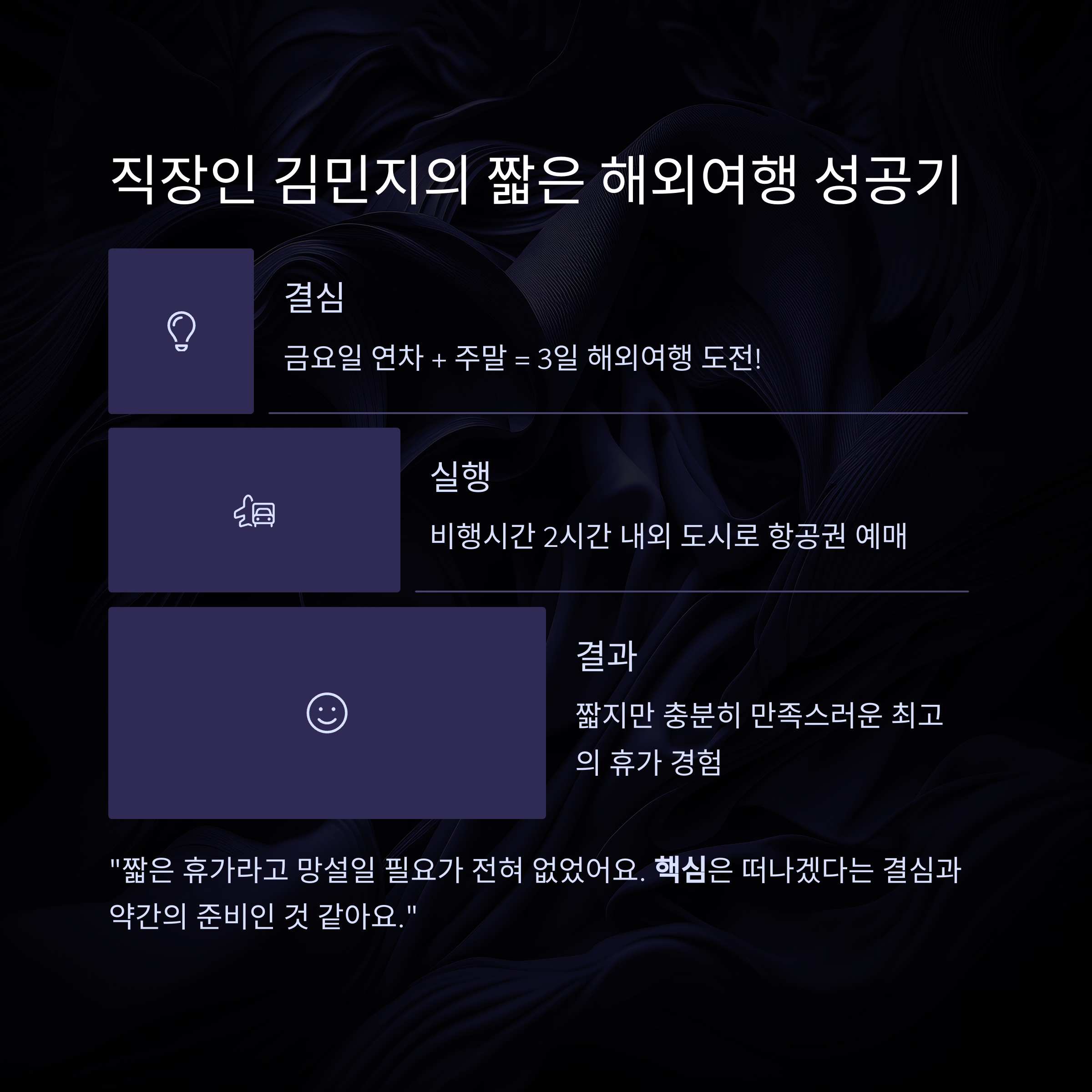 평소 바쁜 업무에 치여 살던 직장인 김민지 씨. 7월 어느 날, 그녀는 문득 짧은 휴가라도 떠나고 싶다는 강한 열망을 느꼈습니다. '금요일 연차를 쓰고 주말을 붙이면 3일인데, 해외여행이 가능할까?' 처음엔 망설였지만, 가까운 해외여행지에 대한 정보를 찾아보면서 용기를 얻었습니다. 비행시간 2시간 내외의 도시, 맛있는 음식이 가득한 곳으로 목적지를 정하고 바로 항공권을 예매했습니다. 짧은 시간이었지만, 현지 음식을 맛보고 새로운 풍경을 보면서 일상의 스트레스를 모두 잊을 수 있었습니다. 김민지 씨는 돌아와서 이렇게 말했습니다. "짧은 휴가라고 망설일 필요가 전혀 없었어요. 핵심은 떠나겠다는 결심과 약간의 준비인 것 같아요. 정말 최고의 선택이었습니다."