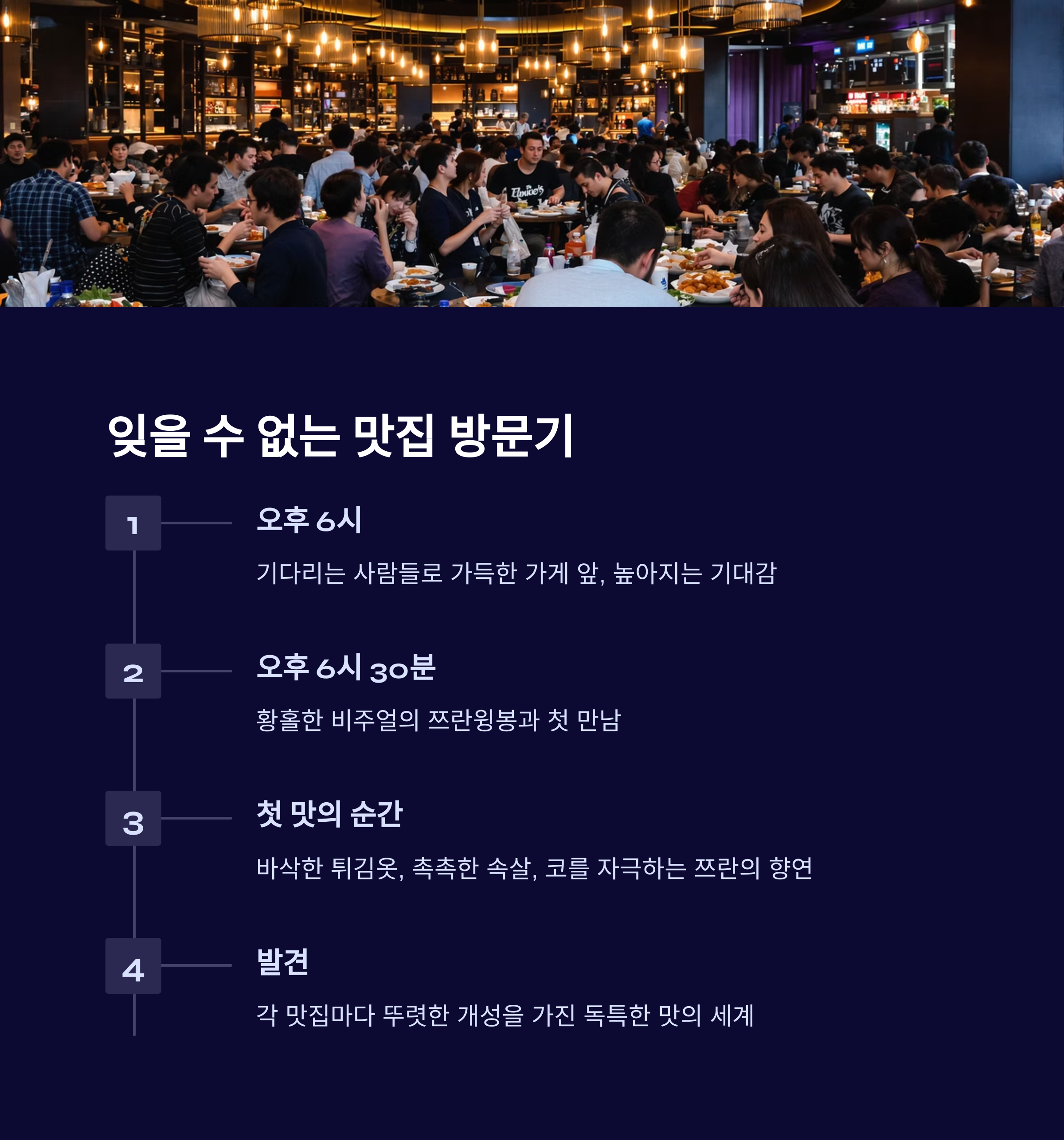 쯔란윙봉의 매력에 푹 빠져 여러 맛집을 탐방하며, 과연 진정한 원조는 어디인지, 그 맛의 비결은 무엇인지 알아보는 여정을 담았습니다. 독자 여러분도 이 글을 통해 쯔란윙봉의 세계로 함께 떠나보시길 바랍니다.