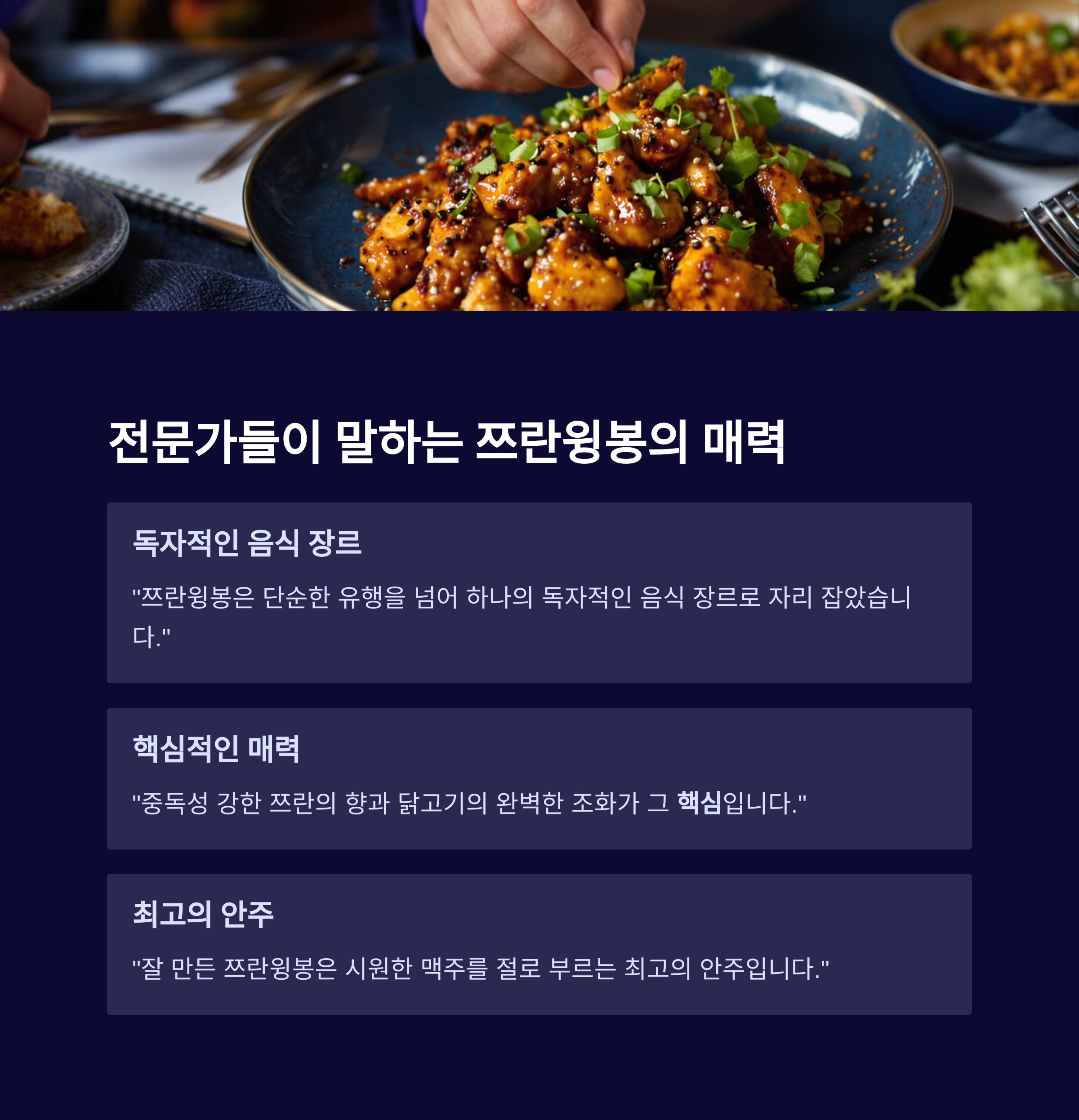 한 유명 음식 평론가는 쯔란윙봉에 대해 이렇게 말했습니다. "쯔란윙봉은 단순한 유행을 넘어 하나의 독자적인 음식 장르로 자리 잡았습니다. 그 핵심은 바로 중독성 강한 쯔란의 향과 닭고기의 완벽한 조화에 있습니다." 또 다른 미식가는 "잘 만든 쯔란윙봉은 시원한 맥주를 절로 부르는 최고의 안주이며, 그 바삭함과 깊은 풍미는 잊을 수 없는 경험을 선사합니다. 여기서 중요한 것은 튀김 기술과 사용되는 쯔란의 질입니다." 라고 언급했습니다. 이처럼 많은 전문가와 애호가들이 쯔란윙봉의 독특한 맛과 향에 매료되어 있으며, 이것이 바로 쯔란윙봉의 인기가 식지 않는 필수적인 이유일 것입니다.
