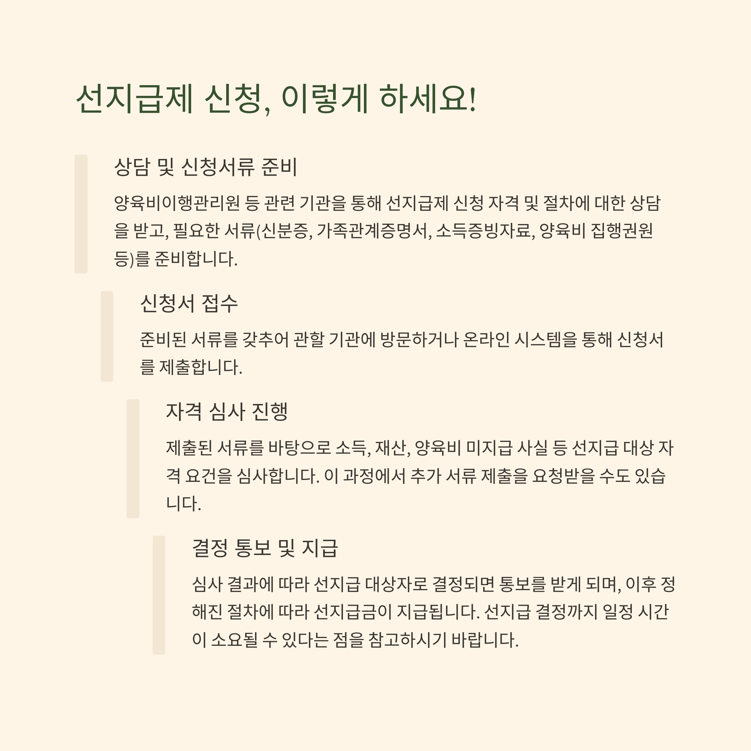 양육비 선지급제 신청 절차는 일반적으로 다음과 같은 단계를 거쳐 진행됩니다.