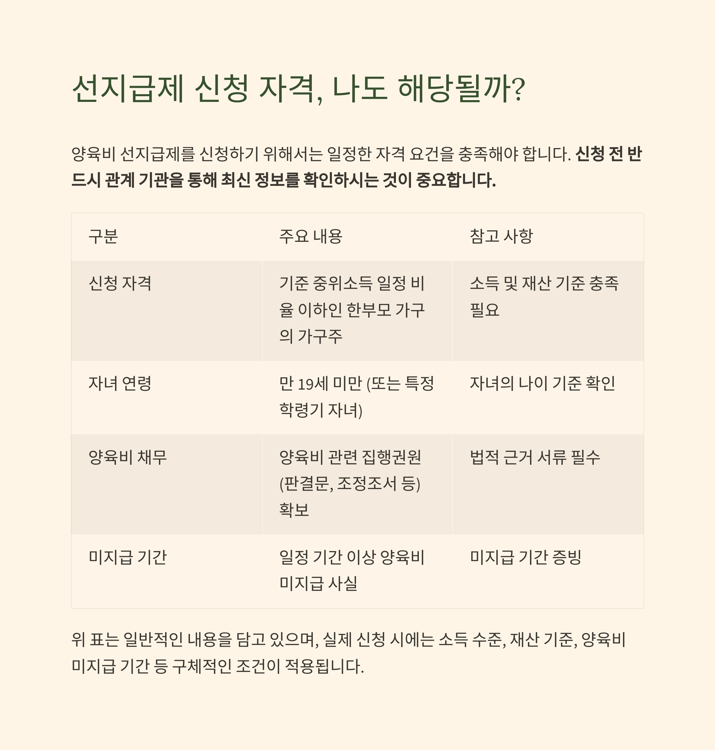 위 표는 일반적인 내용을 담고 있으며, 실제 신청 시에는 소득 수준, 재산 기준, 양육비 미지급 기간 등 구체적인 조건이 적용됩니다.