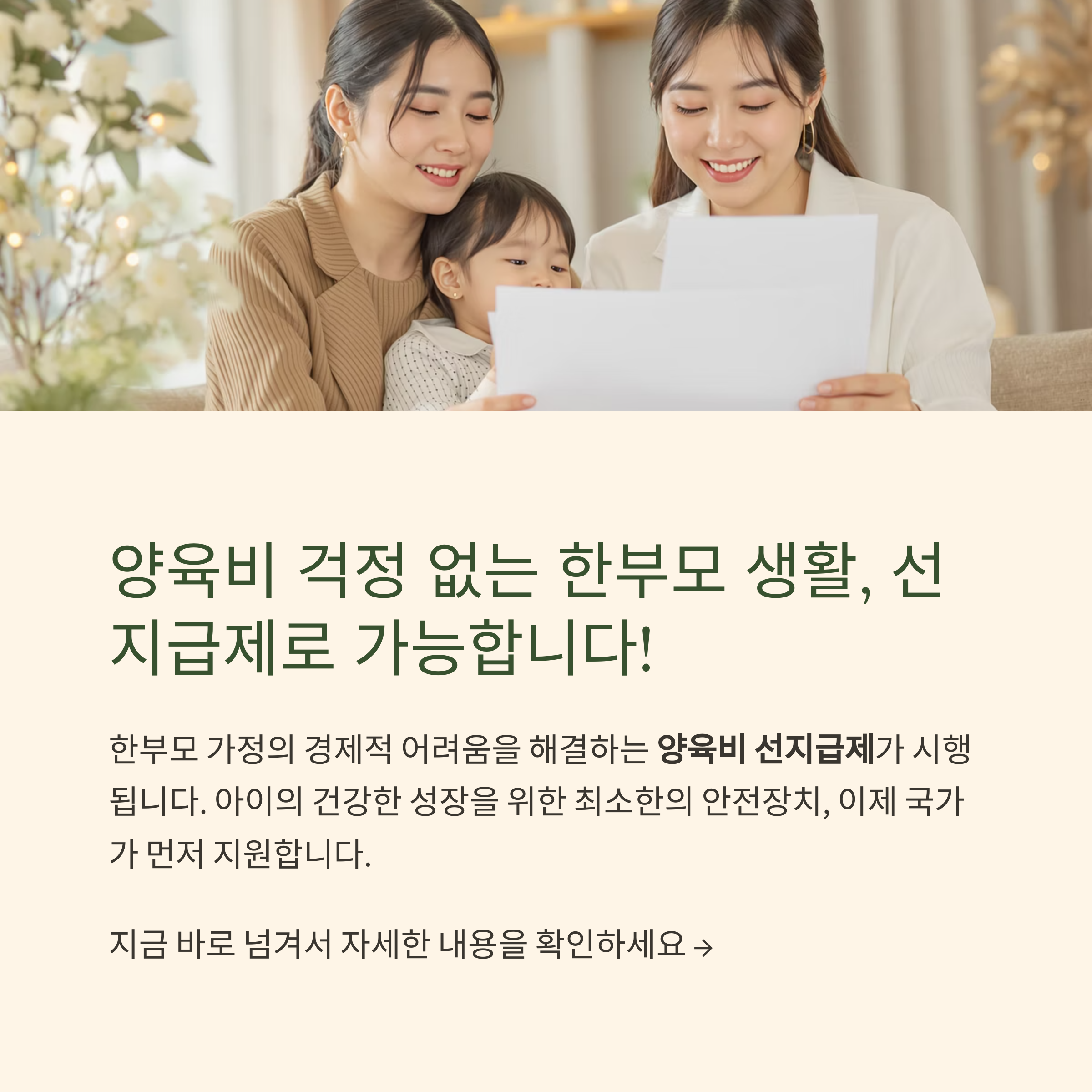 한부모 가정에게 양육비는 아이의 건강한 성장을 위한 최소한의 안전장치와 같습니다.