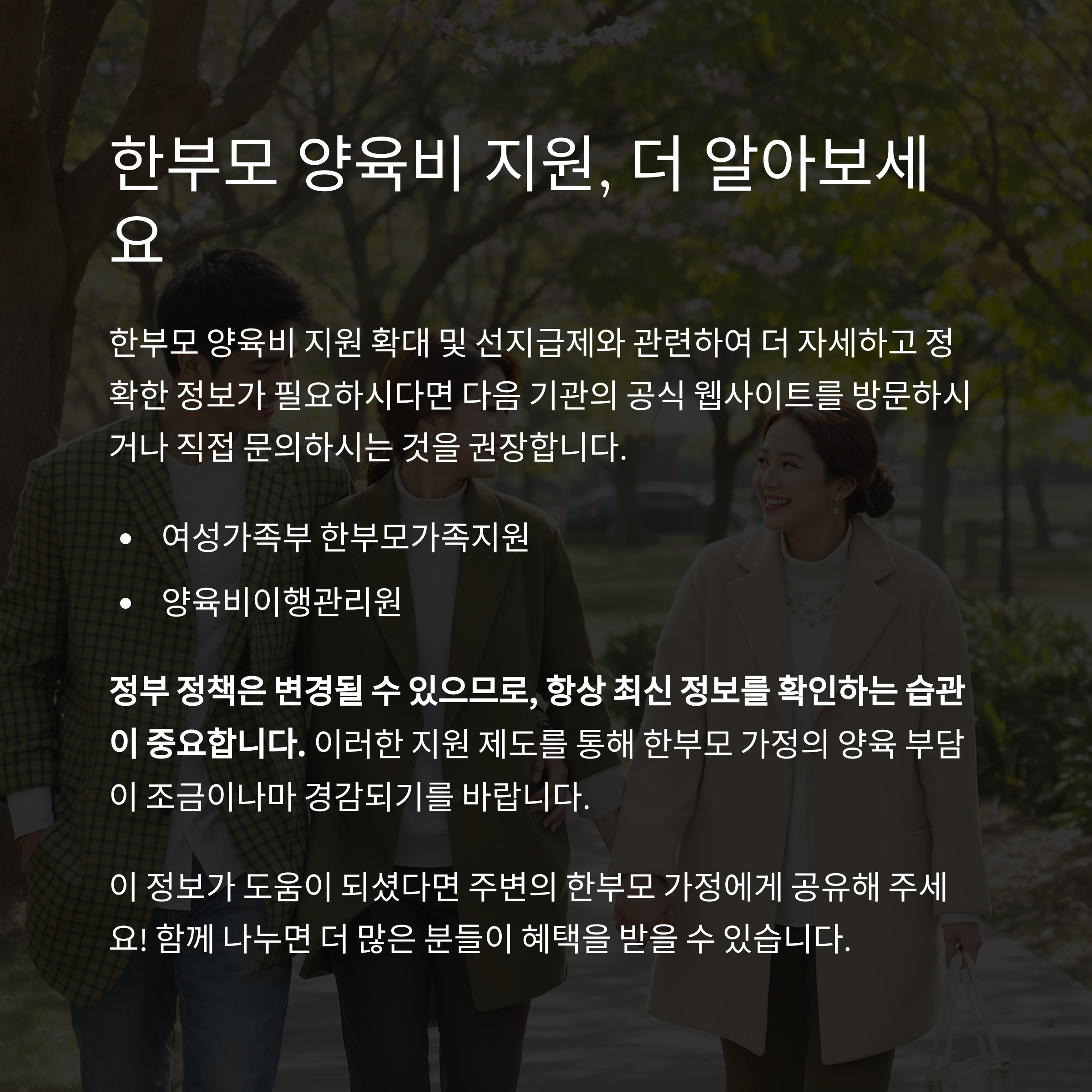 이러한 지원 제도를 통해 한부모 가정의 양육 부담이 조금이나마 경감되기를 바랍니다.