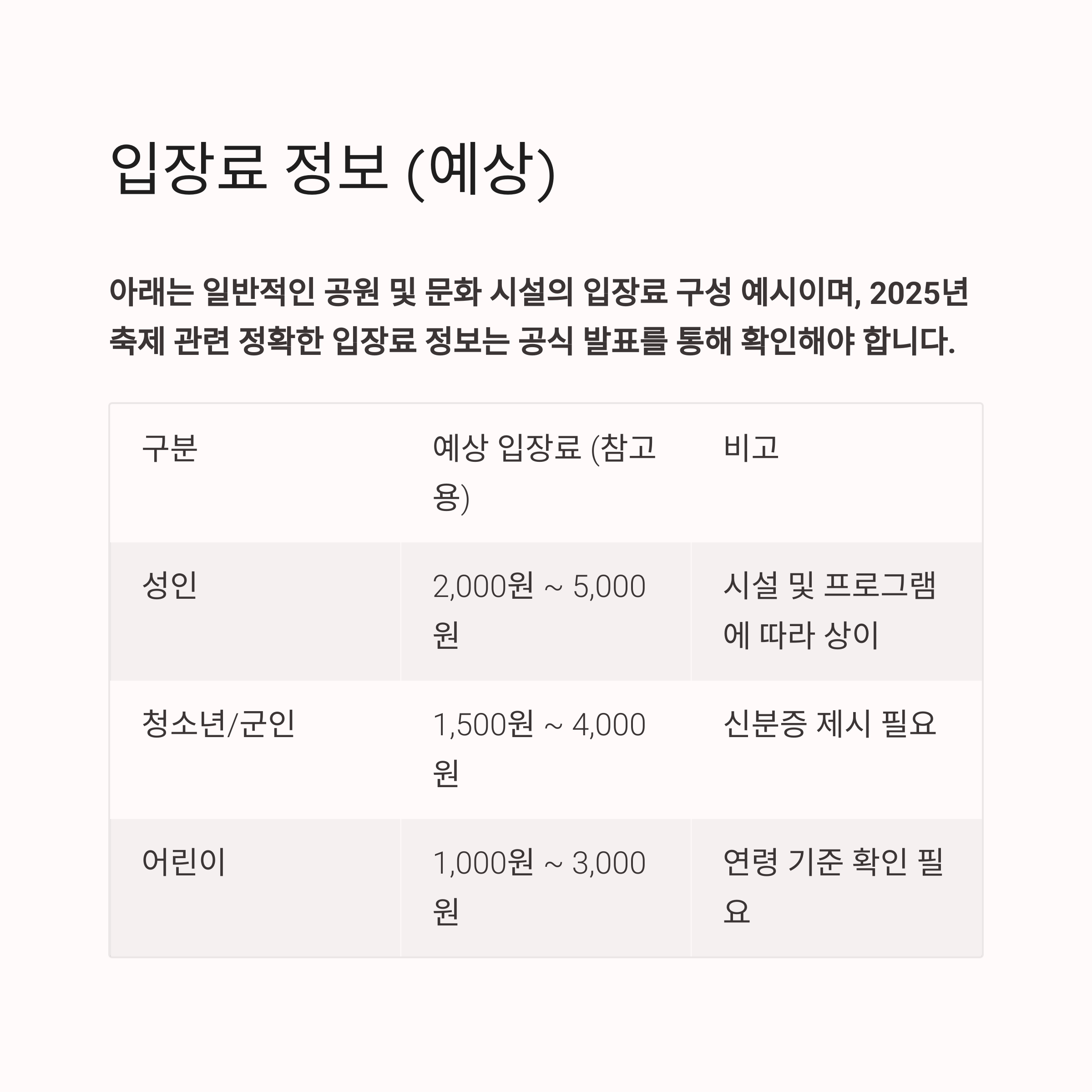 아래는 일반적인 공원 및 문화 시설의 입장료 구성 예시이며, 2025년 축제 관련 정확한 입장료 정보는 공식 발표를 통해 확인해야 합니다.