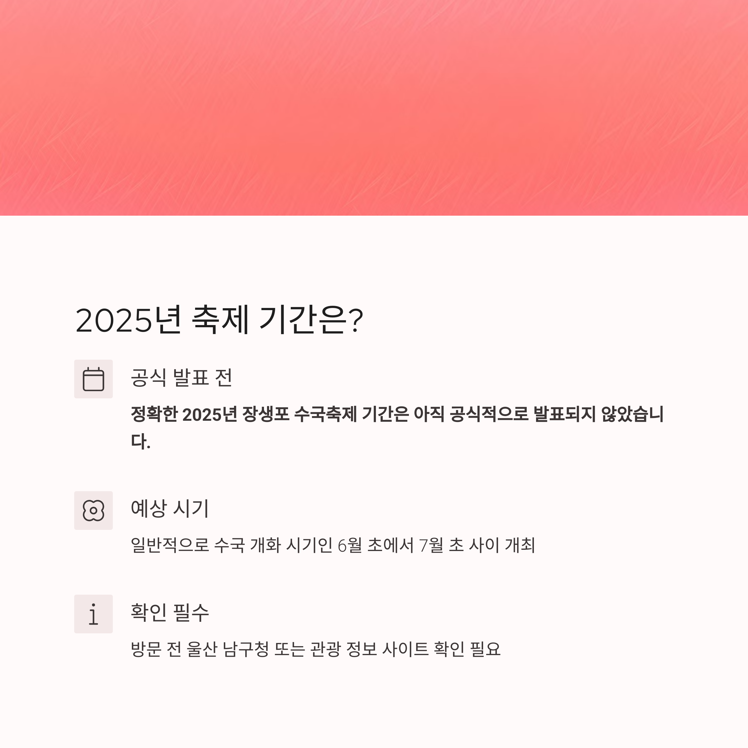 A: 반갑습니다! 정확한 2025년 장생포 수국축제 기간은 아직 공식적으로 발표되지 않았습니다.