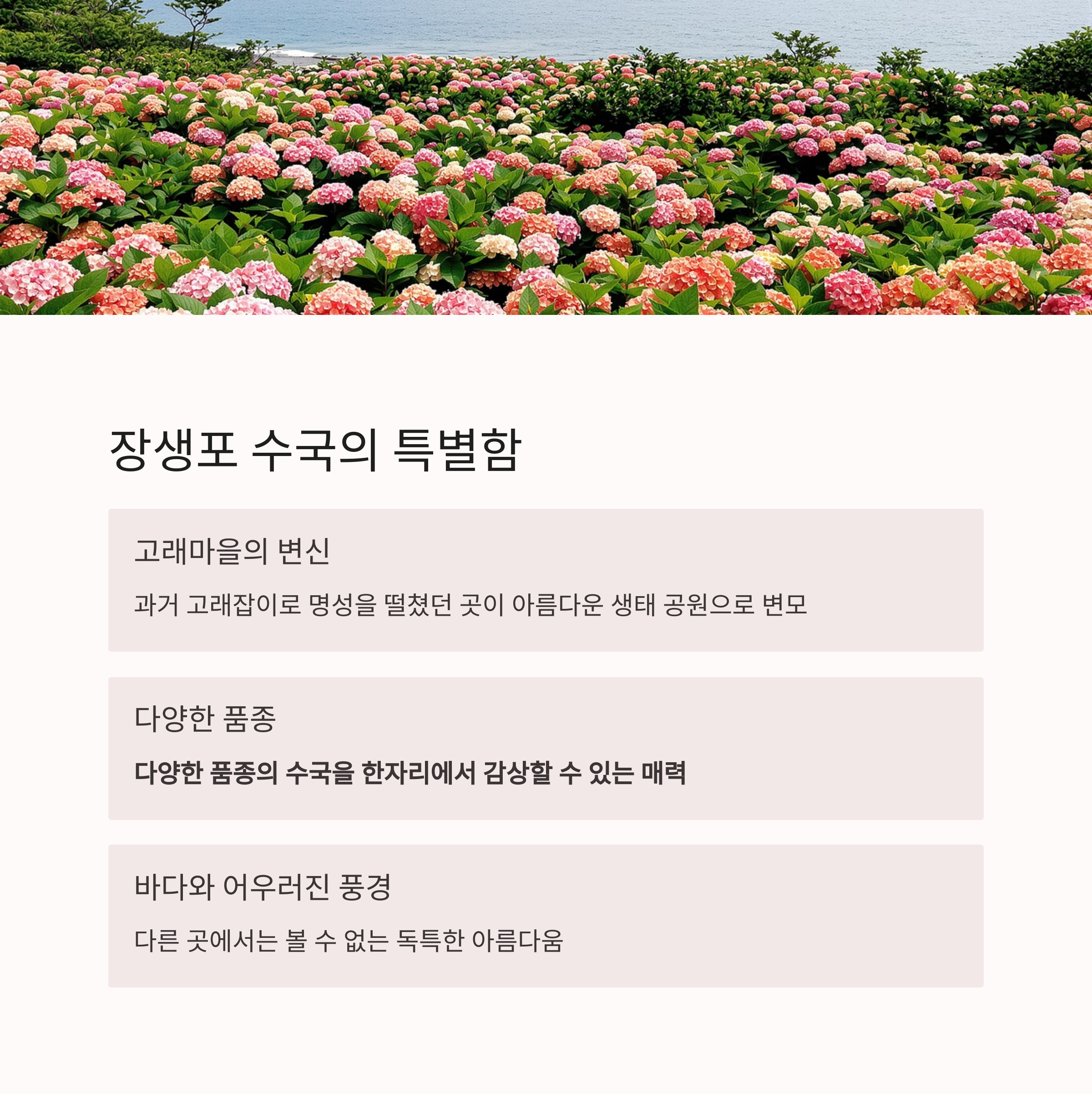 - 수국 외 즐길 거리도 확인하기: 장생포에는 고래박물관, 고래생태체험관 등 다양한 볼거리가 함께 있습니다. 수국 감상과 더불어 다른 체험도 함께 계획해 보세요.